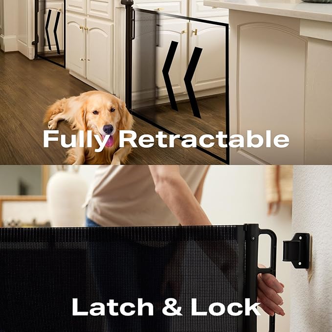 - New Safety Locking: The knob at the top of the mesh gate ensures that the retractable pet gate is easy to use for adults and can be opened and closed with one hand, while curious babies and pets will not be able to make any naughty bids for freedom. For best performance, remember to lock the latch after installation to fully tighten the mesh and ensure stability.