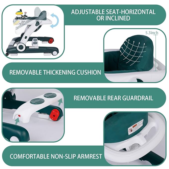 Kinder King Baby Walker with Music & Lights, 5 in 1 Baby Bouncer Activity Walker, Adjustable Height & Seat, Learning-Seated & Toddler Walk-Behind, Safety Bumper, Infant Walker Anti-Rollover, Green