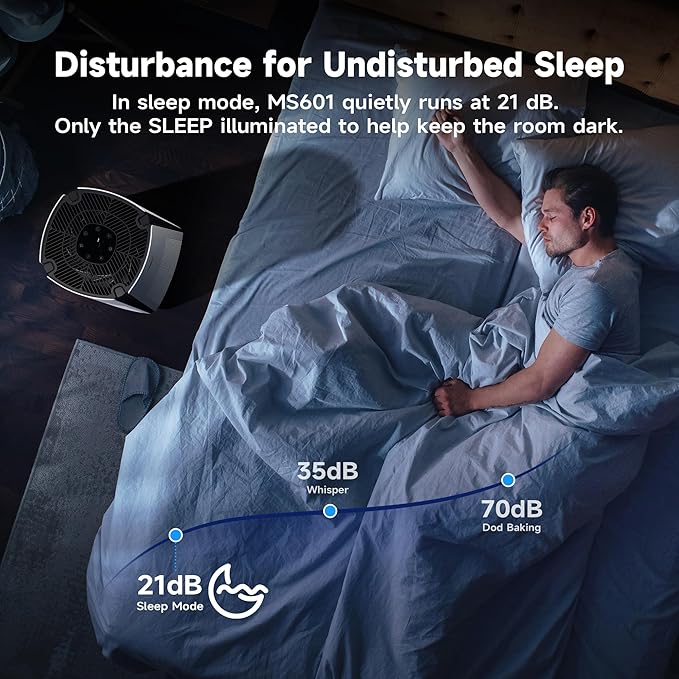 - 470g Activated Carbon Filter: MS601 hepa air purifier features a 4-stage filtration design: Pre-Filter, H13 TRUE HEPA Air Filter, and Double Layer Activated Carbon Filter, capturing 99.97%of 0.3-micron airborne particles and 98.29%of 0.01-micron airborne particles, including allergens, odors, VOCs, smoke, wildfire smoke, pollen, pet dander, dust, fumes and contaminants