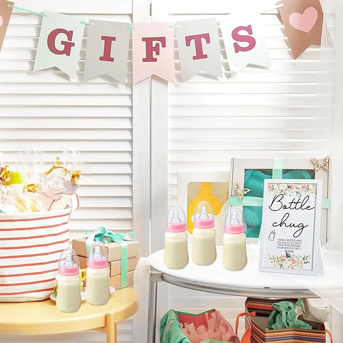 - Functional and Beautiful Designs: the baby shower game sign is decorated with flowers, elegant and attractive in appearance, and can add more charm to your party; Besides, its surface is printed with explainable words, which allow the guests to understand how to play this bottle chug game at once