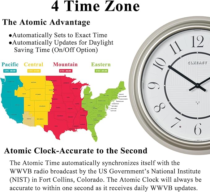 - [Atomic Time-Accurate to the Second] - The Atomic Time Feature conveniently allows the clock to sync with the WWVB radio transmission from Fort Collins, CO, for accurate time updates, and no more worry about Daylight Saving Time any more,our outdoor atomic clocks sets themselves! Automatically set itself and readjust to Daylight Saving Time by WWVB(On/Off option);4 USA TIME ZONE selections: Pacific Standard Time(PST)-"P"; Mountain Standard Time(MST )-"M"; Central Standard Time(CST)-"C"; Eastern Time(EST)-"E" area