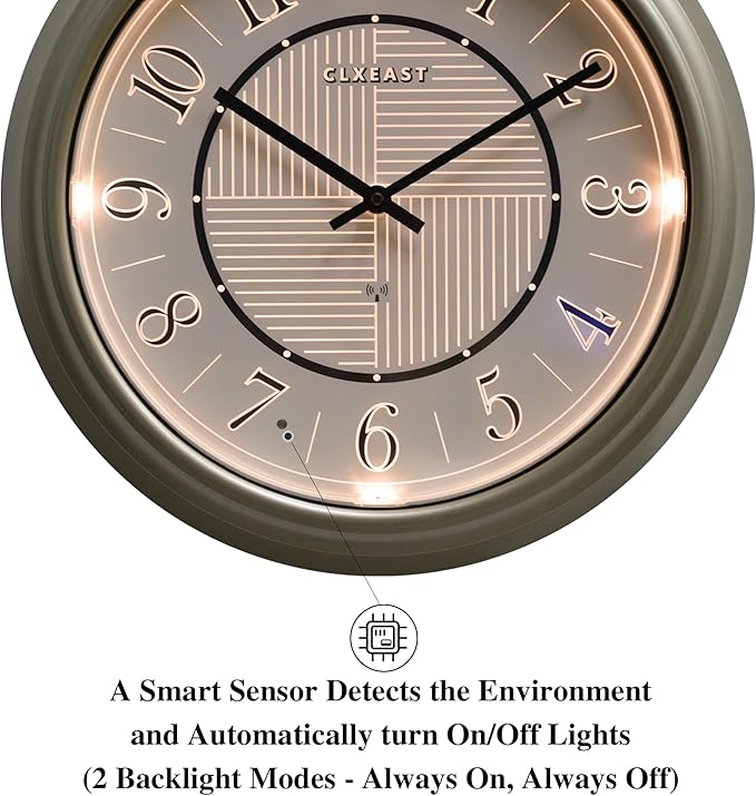 - [In/Outdoor Atomic Clock with Smart AI Sensor Technology]-This unique 14" outdoor ABS plastic wall clock is with integrated light sensor that automatically activates a warm, ambient dial backlight during dark conditions,shuts off in normal daylight; 2 Backlight Modes - Always On, Always Off