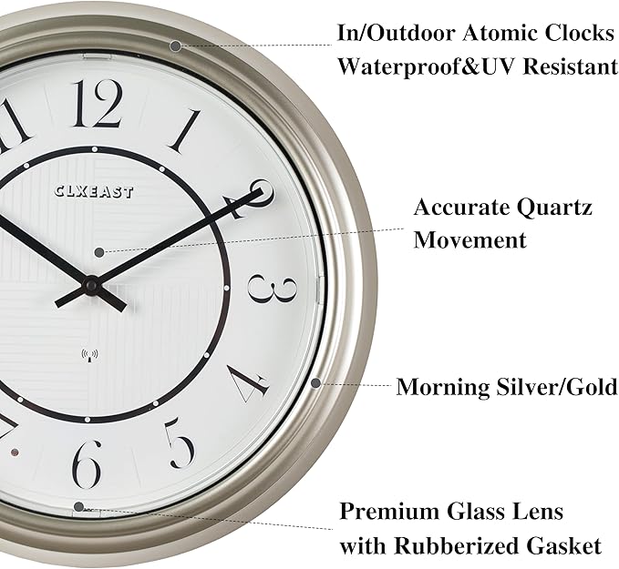 - γIP 56 Weatherproof Atomic Wall Clock]- Thanks to special baking painting morning silver gold,this 14 Inch outdoor clock is UV resistant& weatherproof,sealed with front and back rubberized gasket for protection from water and other outdoor indoor elements.An elegant timepiece for your outdoor garden,pool, patio or backyard,porch,fence,dinning room,bathroom,kitchen,fireplace,entryway,home office,living room.