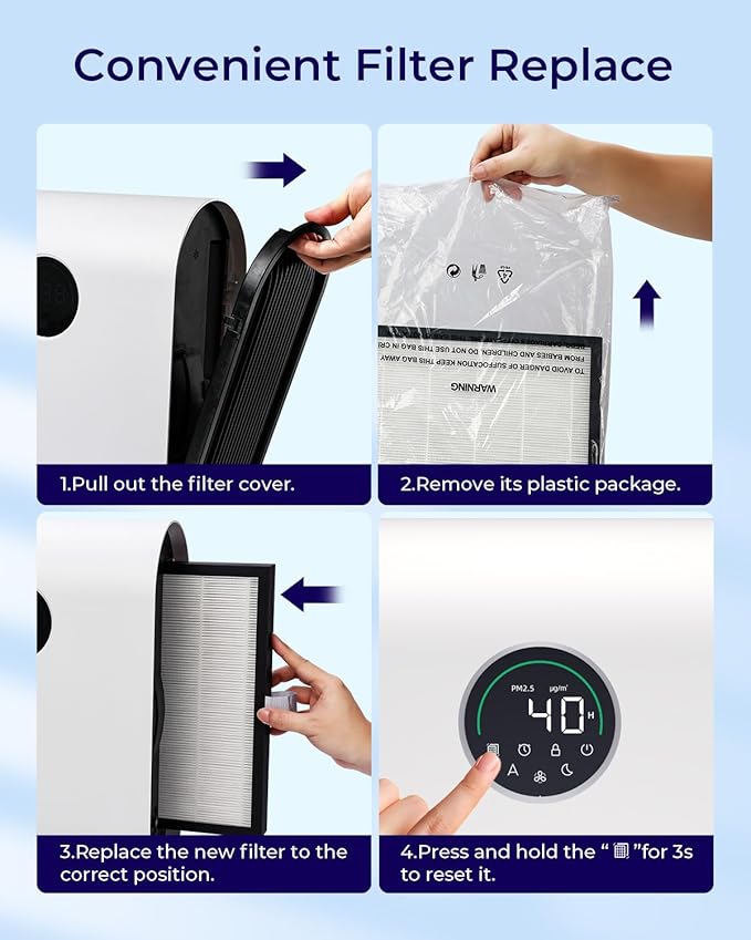 - FILTER REPLACEMENT INDICATOR MADE EASY: The MOOKA air purifiers for home pets make it a breeze! Simply open the filter cover, grab the rope on the side, then you can easily take out or replace the filter inside. Our filter replacement reminder will remind you when it's time to replace the filters. We recommend buying official MOOKA filters to replace the filter every 3-6 months for optimal purification (Search for B0D46Z5SW4 )