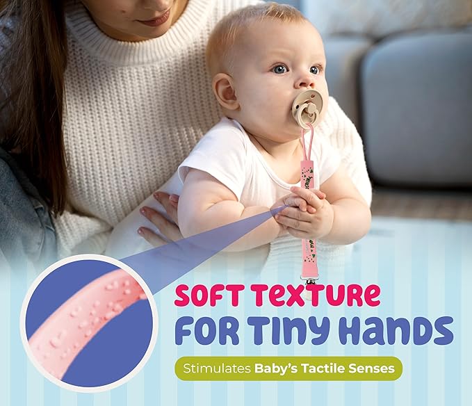 - π§· Pacifier Clips Double as Soothing Teethers Textured silicone surface engages babyβs touch and supports sensory development. A 2-in-1 accessory for comfort and function.