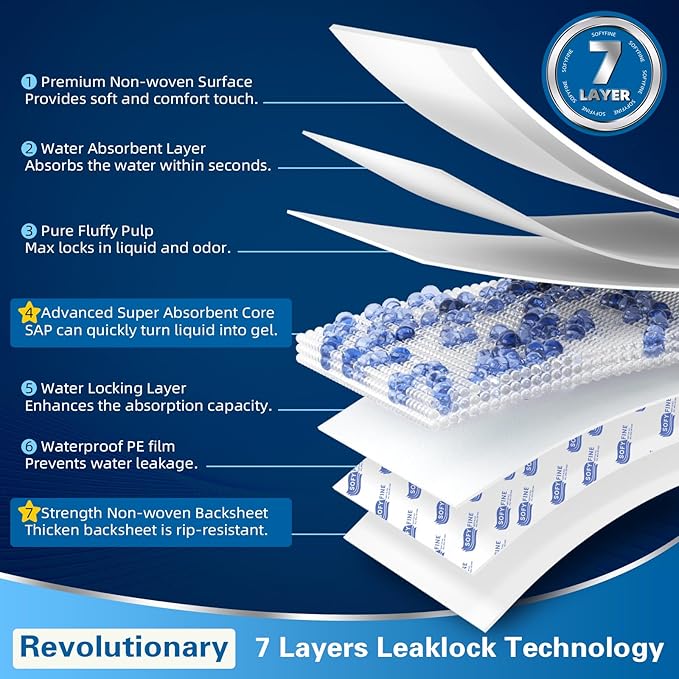 - Revolutionary 7 Layer Leak Lock Technology:Soft non woven surface.Advanced super absorbent core with polymer(SAP) absorbs liquid instantly without swelling or disintegrating.Waterproof PE film prevents leakage.Sturdy backsheet is rip resistant