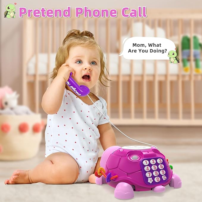 - ENCOURAGE BABY COMMUNICATION: Our turtle baby toy prompts them to pick up the phone, dial, and enjoy familiar greetings like "hello" and "goodbye", providing a realistic phone experience. With 7 real ringtones, babies can engage in pretend play, build muscle memory, improve cognitive skills, and learn everyday concepts.