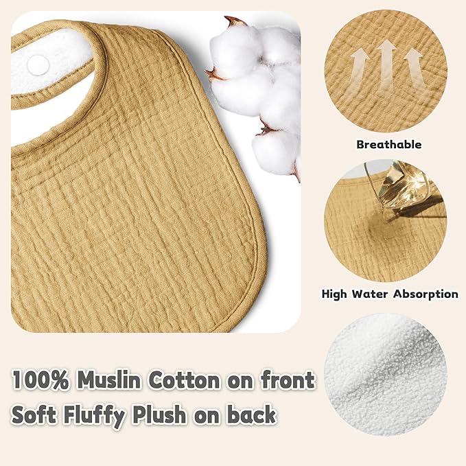- Soft & Superior Absorbency: Our Susurration Muslin Baby Drool Bibs are crafted from muslin cotton on the front, they are backed with water-resistant soft plush to ensure maximum absorption with a skin-friendly, gentle touch for your baby's skin. The dual-layered design ensures both you and your baby remain free from wet clothes all day long.