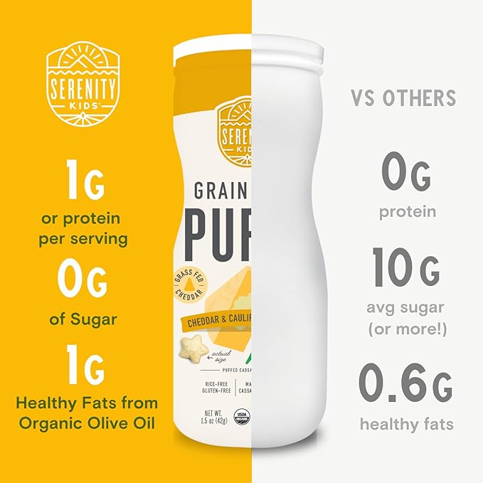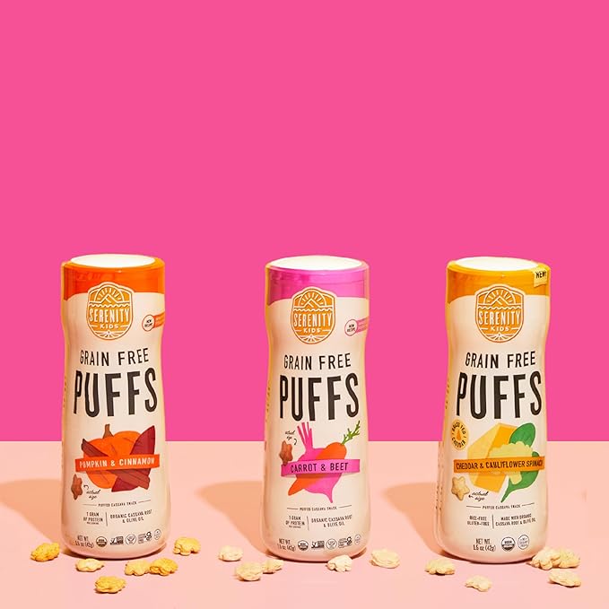 - Snack Time Revolution: Dive into snack time with Serenity Kids Grain-Free Baby Puffs, designed for your little foodie starting at 6 months. These organic baby snacks pack a punch with cassava and veggies, all without added sugar
