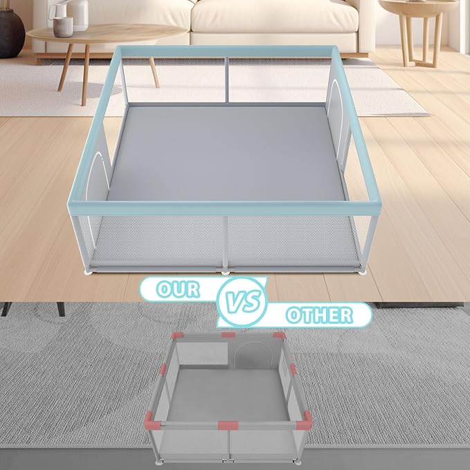 - [ EXTRA LARGE BABY ACTIVITY CENTER] The size of our baby playpen is 79*79*27 inches, the whole playpen area is 43.34 square feet, which can accommodate 6-8 babies to play together at the same time, giving your baby enough space to play, crawl and explore. The scientific height design helps baby practice standing and walking.