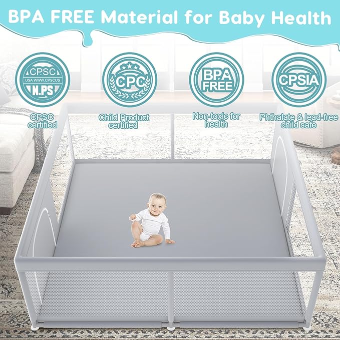 - [SAFETY & HIGH-QUALITY MATERIAL]The material used in our toddler playpen have been certified by the CPSC and ASTM. The fabric is made from high quality waterproof Oxford cloth, which quickly absorbs accidental spills, preventing stains. The frame of the playpen is BPA-free, so it can be used with confidence, and there are many sturdy non-slip safety suction cups on the base that make it difficult to move or tip over. Outside zip design prevents baby from climbing out of the playpen by themself.