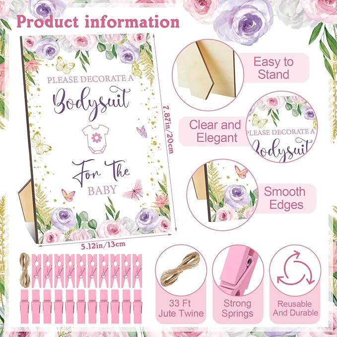 - Baby Shower Game Set: you will get 1 wooden baby shower game sign, measuring 5.1 x 7.9 x 0.2 inches, 25 white jumpsuits in 3 sizes, 25 baby shower stencils, measuring 5.1x 5.1 inches in each, and 24 fabric markers in 12 colors, 50 clothespins, 1 roll of jute rope; The diversity and rich quantities can meet your needs