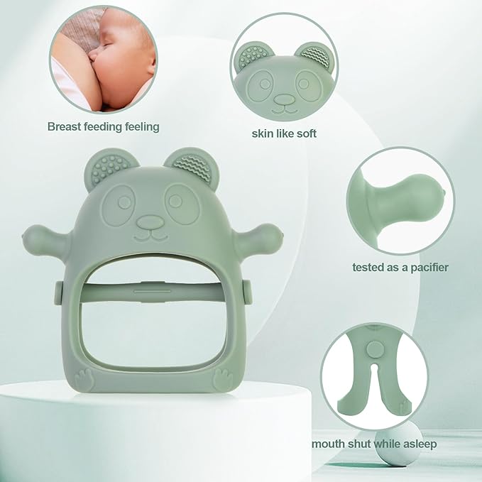 - Baby Teething Relief: Soft silicone teething mittens fit over your baby's little hands, and the inner bar provides extra gripping support for your baby's grip. The two sides mimic the nipple design, which helps to soothe fussy babies and is a good helper for your baby's teething!