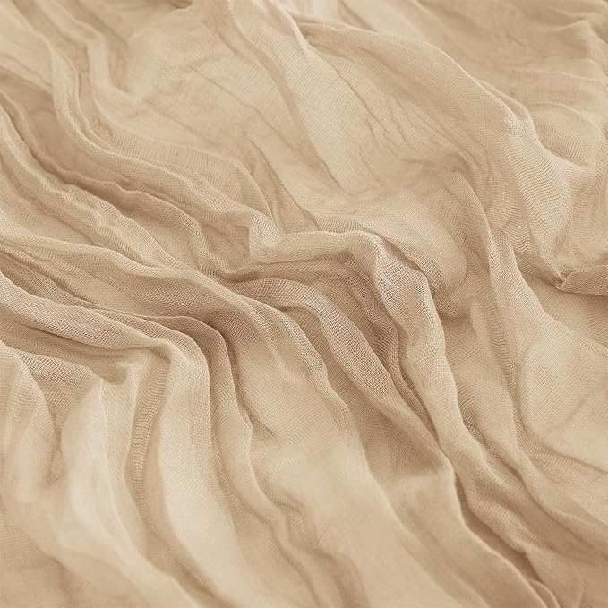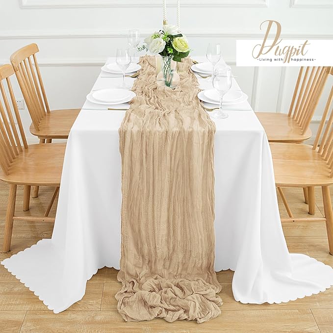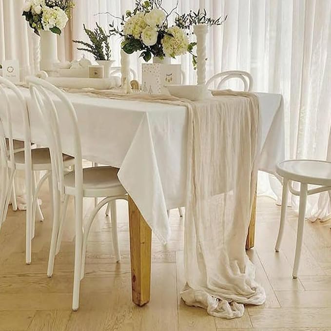 - Package Included:You will get 12 pack of beige table runners, perfect for wedding banquets and various parties, enough to meet your daily use and replacement needs. Each cheese cloth table runner measures approximately 35 x 120 inches/90 x 300 cm, long enough to be used individually on rectangular and round tables, or pieced together for long tables. No matter how it is used, this gauze table runner can be placed perfectly and elegantly on the table or hung on the floor, adding a romantic atmosphere to your occasion