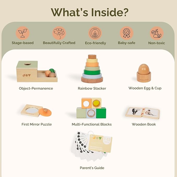 - 🔹 Montessori-Based Parent Guide for Meaningful Connection Alongside the toys, you’ll receive a beautifully crafted Montessori Parent Guide, created to help you use each item intentionally during everyday moments. From suggested play tips to developmental insights, the guide empowers caregivers to support their baby's learning journey with confidence and calm. It's a bridge between Montessori philosophy and real family life, turning ordinary play into meaningful connection.