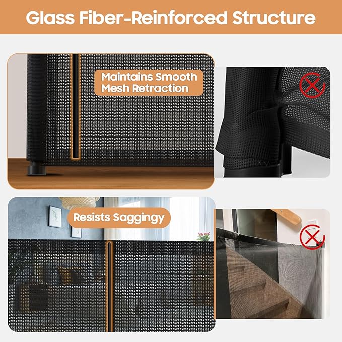 - 【Fiberglass Support】We have upgraded the retractable gate with fiberglass support strips, which prevent kids and pets from going under the mesh and reduce wrinkling. The mesh expands smoothly without getting stuck, making it effortless to use.