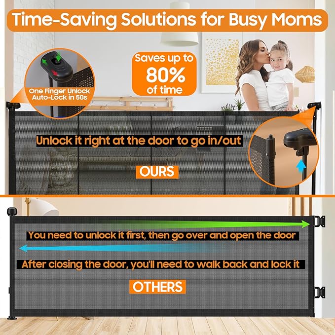 - 【Specially Designed for Busy Moms】We have 2 locking mechanisms. One is a mesh locking mechanism that automatically locks after a countdown timer, and also controls the extension and retraction of the mesh. The other is a gate locking mechanism - simply unlock the gate right where you are, and the gate will open. And the gate will automatically lock when closed, for quick and easy access. Unlike other baby gates, you don't have to go through a multi-step process of unlocking the mesh, then opening the gate, and finally remembering to lock the mesh again. Our baby gate saves you that hassle.