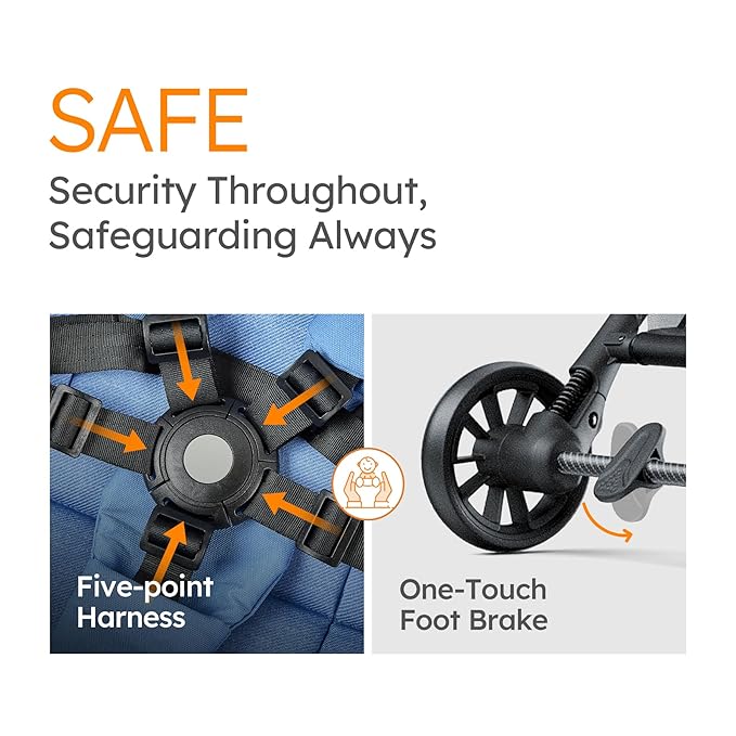 - Certified and Safety: Mamazing foldable stroller exceeds CPSC and ASTM standards with OEKO-TEX fabric safety certifications, ensuring a safe environment for your baby. It features a foot-operated brake for quick stops, adjustable 5-point harness, and shoulder straps for growing children. The EVA shock-absorbing tires with all-wheel suspension provide a smooth ride for your baby.