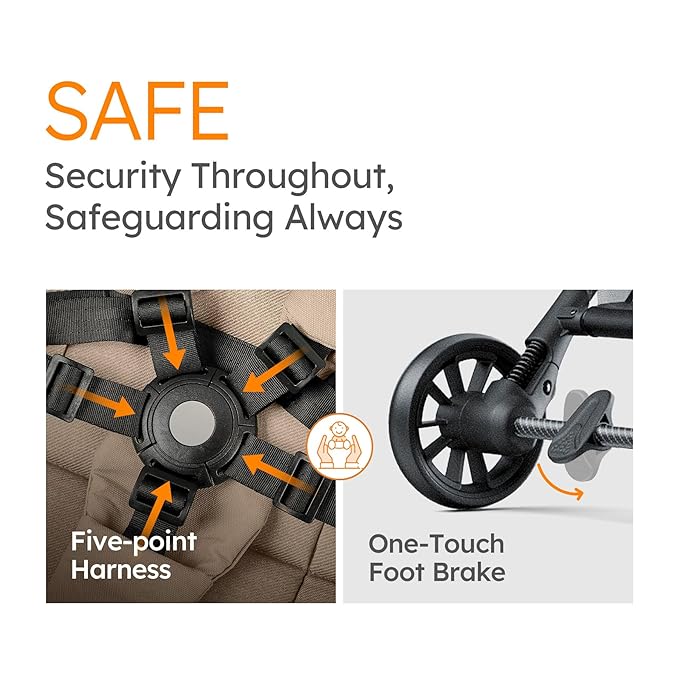 - Certified and Safety: Mamazing foldable stroller exceeds CPSC and ASTM standards with OEKO-TEX fabric safety certifications, ensuring a safe environment for your baby. It features a foot-operated brake for quick stops, adjustable 5-point harness, and shoulder straps for growing children. The EVA shock-absorbing tires with all-wheel suspension provide a smooth ride for your baby.