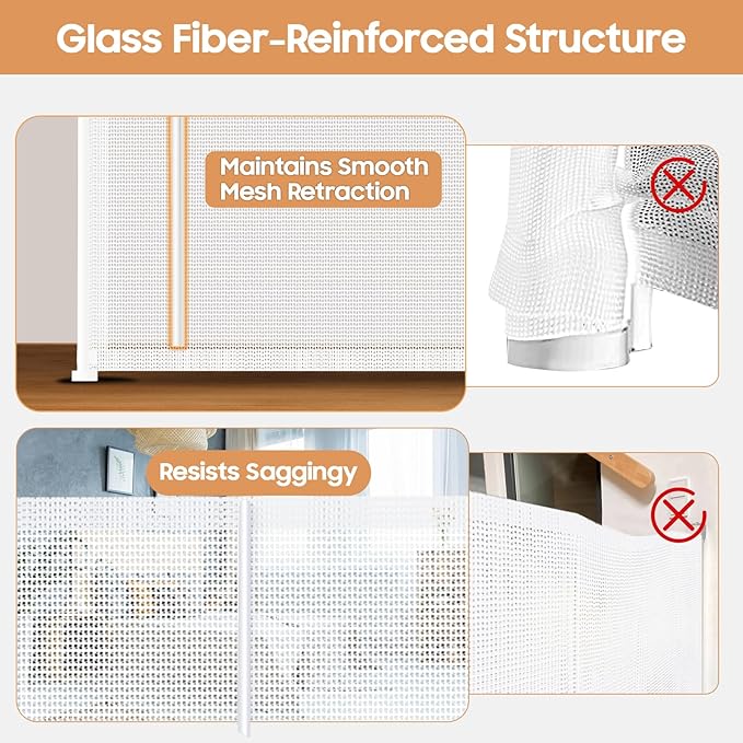 - 【Fiberglass Reinforced】The upgraded retractable baby gate now includes fiberglass support strips, which not only prevent kids and pets from going under the mesh, but also reduce wrinkling of the mesh. The retractable mesh gate expands smoothly without getting stuck, making it smoother and more effortless to use.