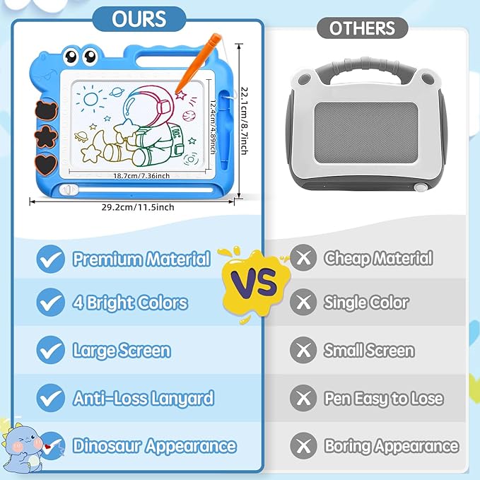 - 【Colorful Magnetic Drawing Board with Dinosaur Look】 This cute dinosaur doodle board features four distinct color zones - blue, yellow, purple and green - the vibrant colors and rainbow creations will excite young artists, allowing kids to explore their creativity and easily draw colorful masterpieces, help baby color and shape cognition, explore creative thinking and strengthen kids'concentration. Plus, the sliding knob allows for endless drawing, whenever inspiration strikes.