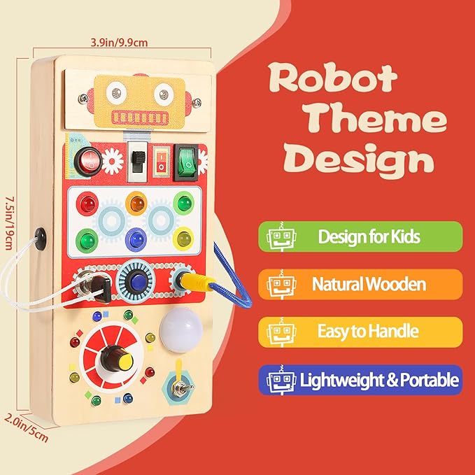 - 【Learning and Playing and Exploring】Robot Busy Board with LED can identify different colors, switches. The children's activity board can promote the brain development of children. These busy board not only light up the LED, but also have sound settings to attract your child's attention. This sensory toy for 3 year olds can exercise your baby's logical thinking, hands-on and exploratory skills