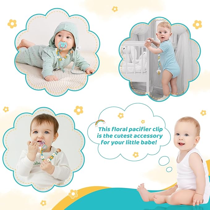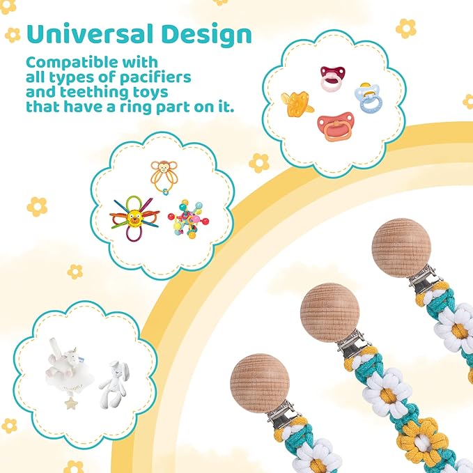 - 🌼【Handmade & Unique Daisy Design】 Each pacifier clip is hand-woven with soft cotton cord, featuring a chic daisy pattern and vibrant colors for a boho-chic style. Perfect for adding a fashionable touch to your baby’s outfits while keeping their pacifier secure. (No two clips are exactly alike!)