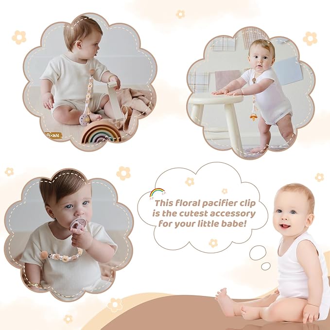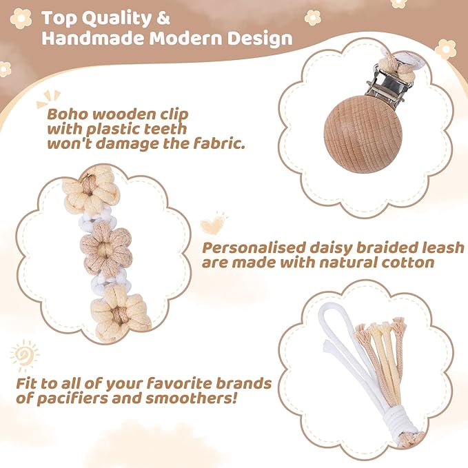 - 🌼【Handmade & Unique Daisy Design】 Each pacifier clip is hand-woven with soft cotton cord, featuring a chic daisy pattern and vibrant colors for a boho-chic style. Perfect for adding a fashionable touch to your baby’s outfits while keeping their pacifier secure. (No two clips are exactly alike!)
