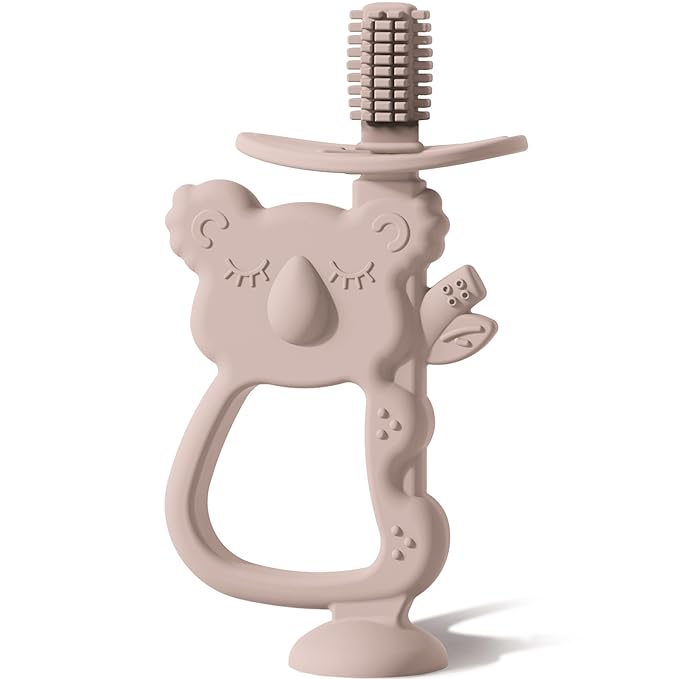 - Perfect for Teething and Toothbrushing - Our koala transitional silicone toothbrush works as toothbrush and baby teething toy. The ultra-soft bristles massage your little one's tender teeth and gums 360 ° to soothe their teething pain while they chew.It is also very easy for baby to grab and safe to chew or practice brushing on their own as well.It looks close to a regular toothbrush,which is great for transition from finger brush to baby held toothbrush.