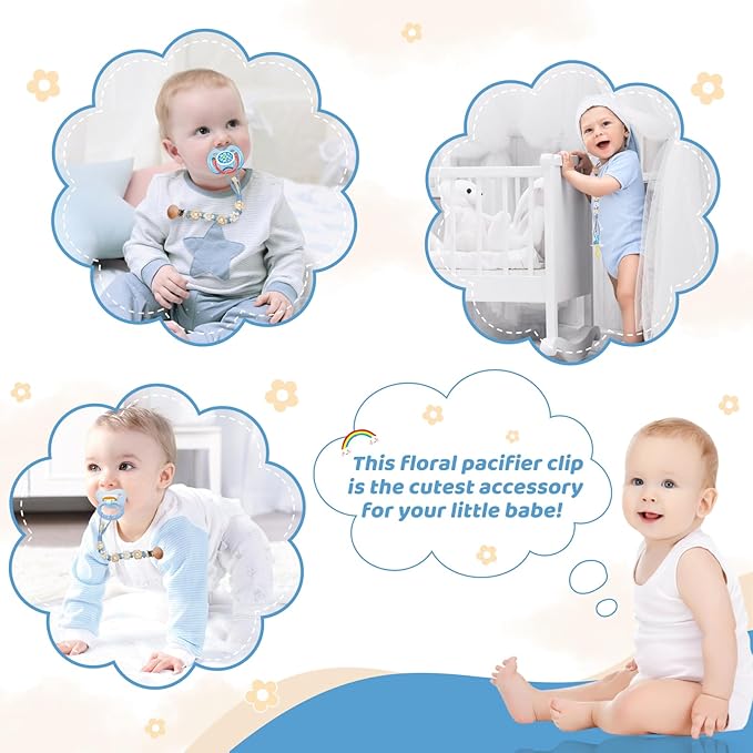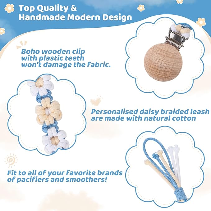 - 🌼【Handmade & Unique Daisy Design】 Each pacifier clip is hand-woven with soft cotton cord, featuring a chic daisy pattern and vibrant colors for a boho-chic style. Perfect for adding a fashionable touch to your baby’s outfits while keeping their pacifier secure. (No two clips are exactly alike!)