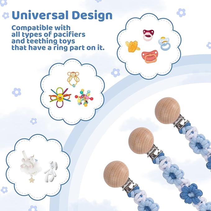 - 🧷【Universal Fit for Pacifiers & Toys】 Works with all standard pacifiers, teethers, and small toys—no more lost or dirty binkies! Keeps essentials within reach on strollers, car seats, or baby carriers. (Suitable from newborn+)