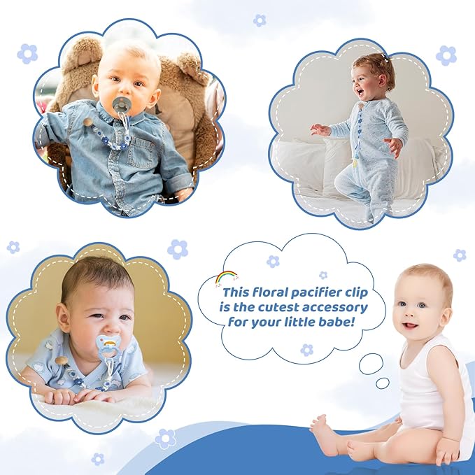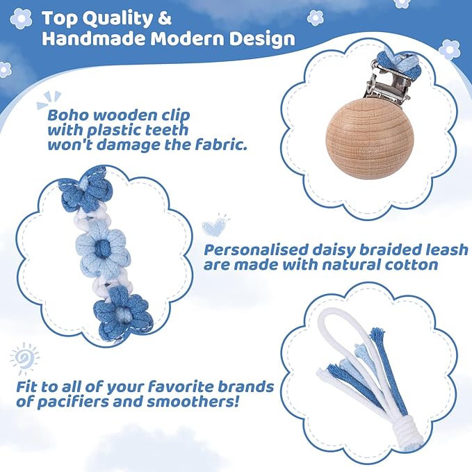 - 🌼【Handmade & Unique Daisy Design】 Each pacifier clip is hand-woven with soft cotton cord, featuring a chic daisy pattern and vibrant colors for a boho-chic style. Perfect for adding a fashionable touch to your baby’s outfits while keeping their pacifier secure. (No two clips are exactly alike!)