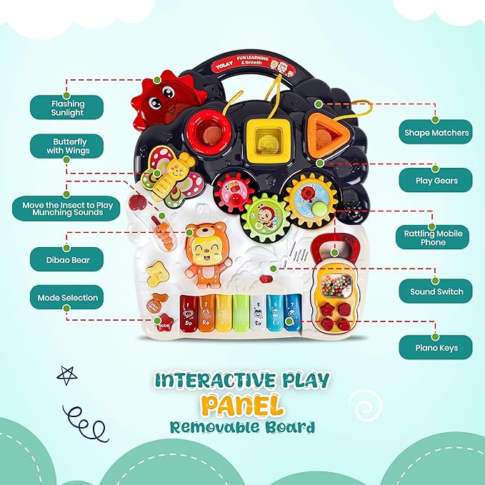 - 360Β° Interactive Play: Lights, sounds, music and engaging fun buttons on the vibrant play panel, stimulate sensory development and keep little hands busy