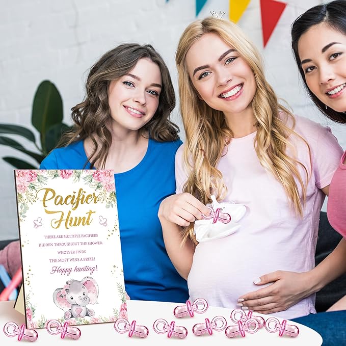Thyle 51 Pcs Pacifier Hunt Baby Shower Games Include Hunt Sign and 50 Acrylic Pacifiers for Baby Shower Game Decoration Gift Sets Gender Reveal Party Decor(Pink Elephant)