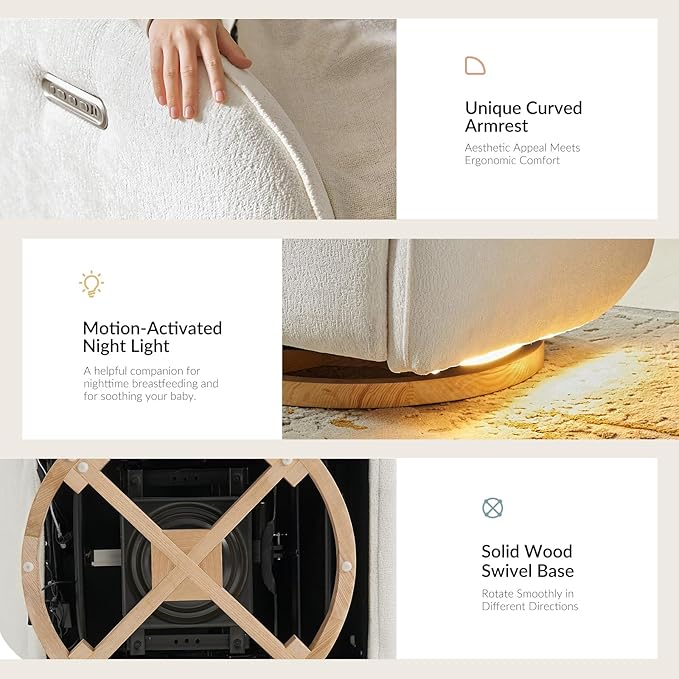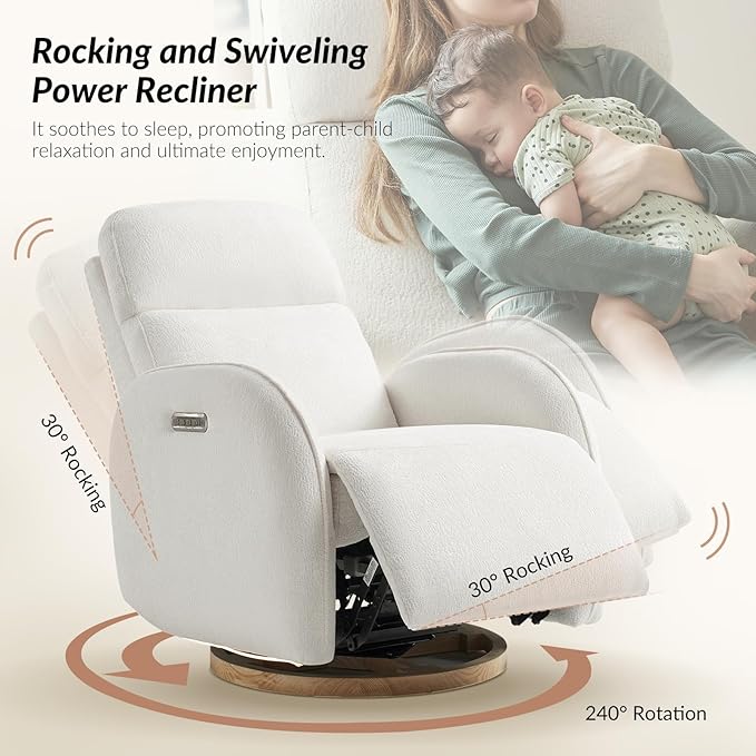 - Swivel and Rocking Function - This nursery recliner is designed to meet the needs of both parents and babies in the bedroom or nursery. It features a 270° swivel, 30° rocking, and 105-133° reclining function that can be operated by the push of a button. Whether you're feeding, soothing your baby to sleep, reading, or just relaxing, it offers maximum comfort and convenience.