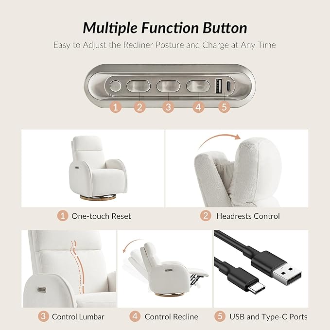 - Adjustable Headrest and Lumbar Support - Our nursery glider is equipped with multifunctional buttons that enable you to adjust the headrest and lumbar support, helping you find a comfortable position for both yourself and your baby. The electric headrest and lumbar support help reduce tension and strain on your head and back, allowing you to enjoy extended periods of relaxation without discomfort.