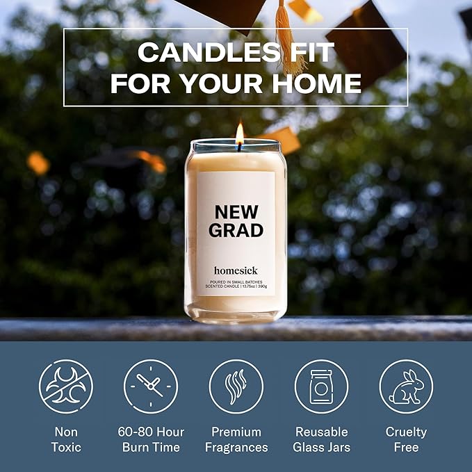 - Pomp and Circumstance: Years of hard work, determination, and sacrifice made this moment possible. Keep eyes bright and focused on the future with the New Grad candle from Homesick. 13.75 oz.