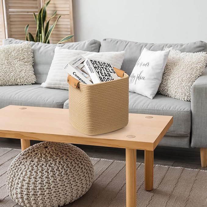 - Modern Charm: The storage cubes feature leather handles that provide comfortable grip for easy carrying. Woven storage bins are made of 100% cotton to ensure long lasting use. The contrast between the cotton and leather creates a stylish and modern look