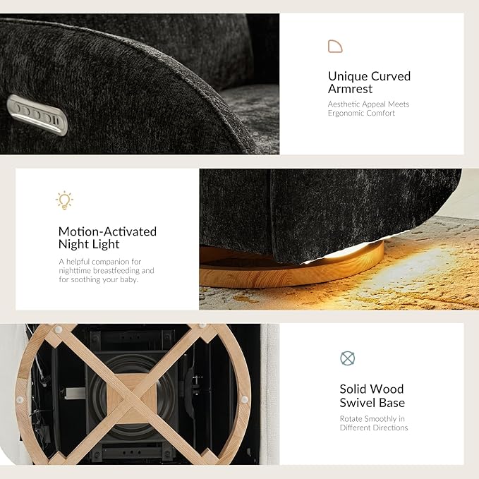 - Swivel and Rocking Function - This nursery recliner is designed to meet the needs of both parents and babies in the bedroom or nursery. It features a 270° swivel, 30° rocking, and 105-133° reclining function that can be operated by the push of a button. Whether you're feeding, soothing your baby to sleep, reading, or just relaxing, it offers maximum comfort and convenience.
