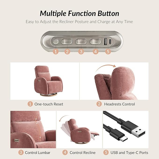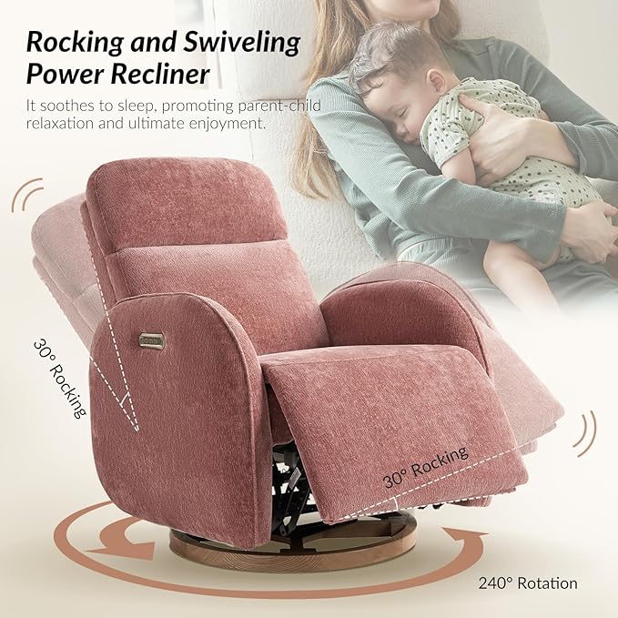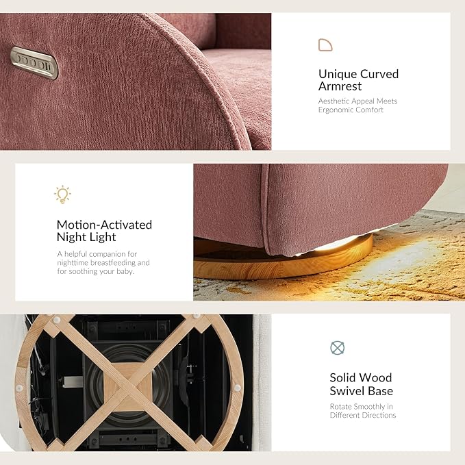 - Swivel and Rocking Function - This nursery recliner is designed to meet the needs of both parents and babies in the bedroom or nursery. It features a 270° swivel, 30° rocking, and 105-133° reclining function that can be operated by the push of a button. Whether you're feeding, soothing your baby to sleep, reading, or just relaxing, it offers maximum comfort and convenience.