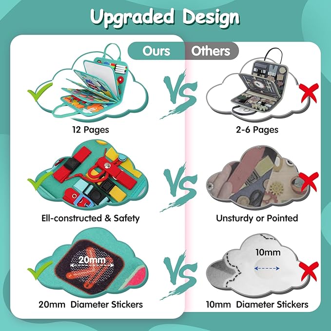 - EXCLUSIVE DESIGN BUSY BOARD:Upgraded and Patented Designed sensory toys with 12 pages,offers about 18 basic life skills learning and 12 preschool learning activities, including alphabets & phonics, shapes, numbers, body parts, senses, jigsaw puzzle game, brushing game, clocks, weather, week, season, months game. Each activity on the board is carefully crafted to captivate little ones and keep their hands and minds busy