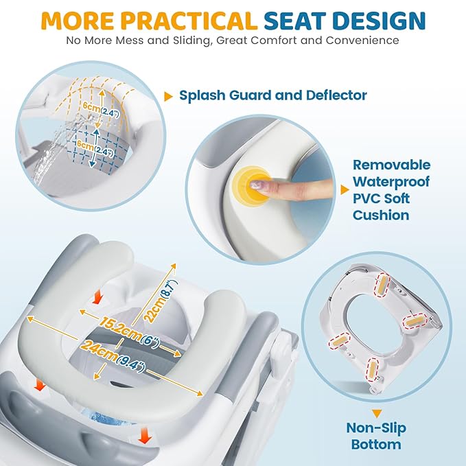 - π π¦π’ππ§ π£πππππ‘π & π§ππ’π¨πππ§ππ¨π πππ¦πππ‘π¦: Furnished with a waterproof PVC seat cushion that provides a soft touch and excellent resilience, Orzbow Toddler Toilet Seat with steps suitable for all seasons and gentle on baby's delicate skin. The downward extension of the splash guard by 2.36"/6cm minimizes cleaning efforts. Ergonomically designed handles facilitate secure gripping, while the incorporation of charming cartoon animal designs and vibrant colors stimulates baby's interest, transforming toilet training into an enjoyable experience.