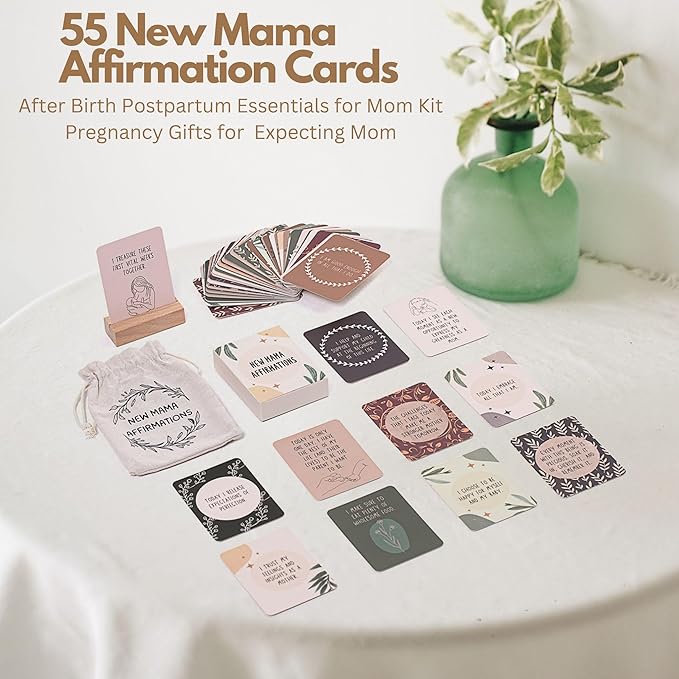 - 【55 Mom Affirmation Cards with Wooden Stands and Fabric Bag Packaging】55 New Mama Affirmation Cards for postpartum self-care and expecting moms. These cards offer peace, encouragement, acceptance, and self-love, helping new moms embrace changes in their lives and bodies. Filled with only positive words, these cards inspire a positive mindset. Perfectly sized at 3''x4'' with a minimalist design.