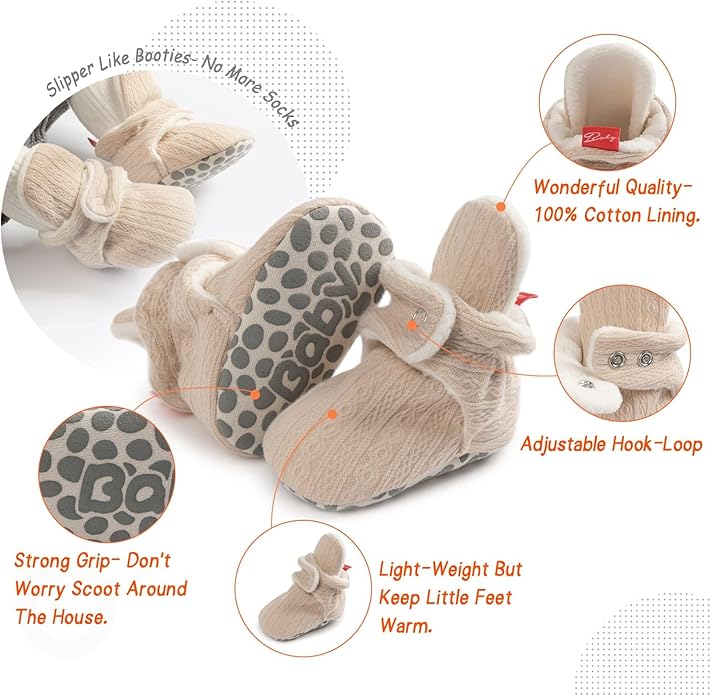 - Got A Little Kicker: Anti-slip bottoms makes learning to walk safer and easier. These stay on crib booties are wrapped, cozy & comfortable on baby's skin; When you're tying to layer up, hook & loop closed is really adorable; Elastic ankle support makes putting them on and taking them off, still keep feet covered, warm all day and night