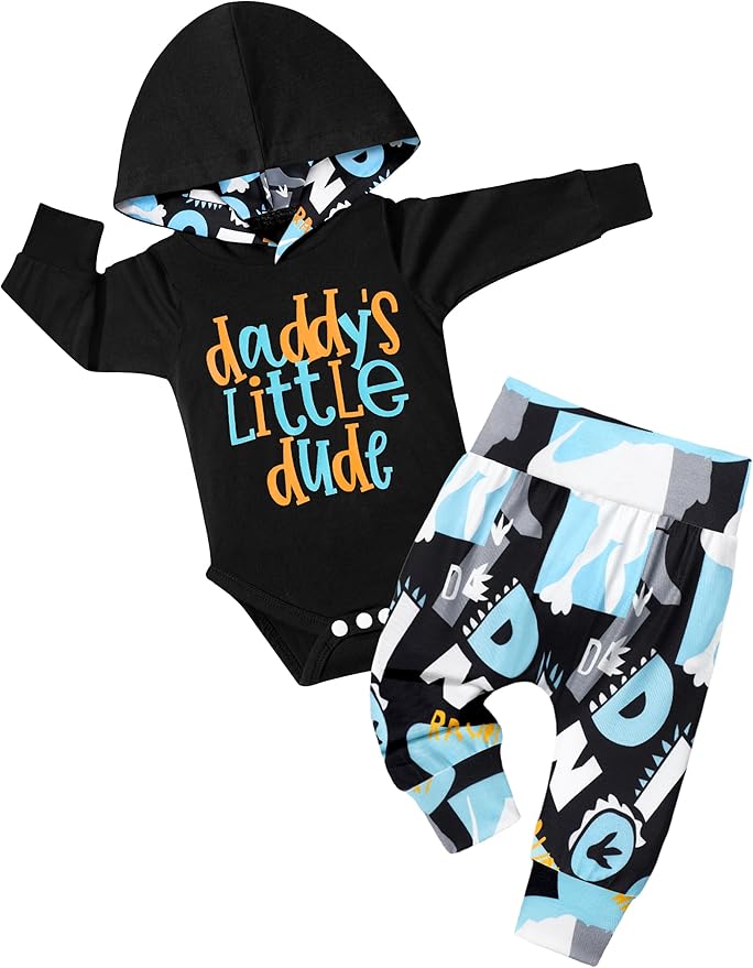 - 👶🏻👦🏻Unique design:The hooded design of the black baby boy clothes can protect the newborn's head very well in winter. Hoodie rompers printed with the letters "daddys little dude" are the best gift for babies from mothers and fathers. Baby boy clothes are made with buttons at the bottom, easy to open and close the newborn diaper change is a good thing for the baby, newborn long pants can be good to protect the baby's legs.