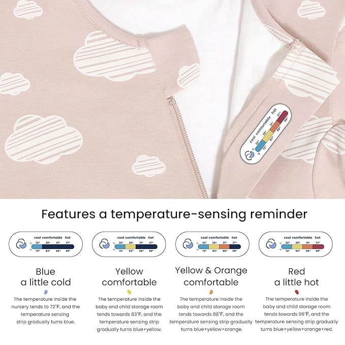 - Temperature Sensing Strip - Exclusive Design by Kaiya Baby. Our clothing features an internal temperature sensing strip located at the chest area. This strip displays the surface temperature where the product contacts the skin, allowing parents to adjust the baby's clothing based on temperature changes without physically touching the baby, ensuring a peaceful sleep.