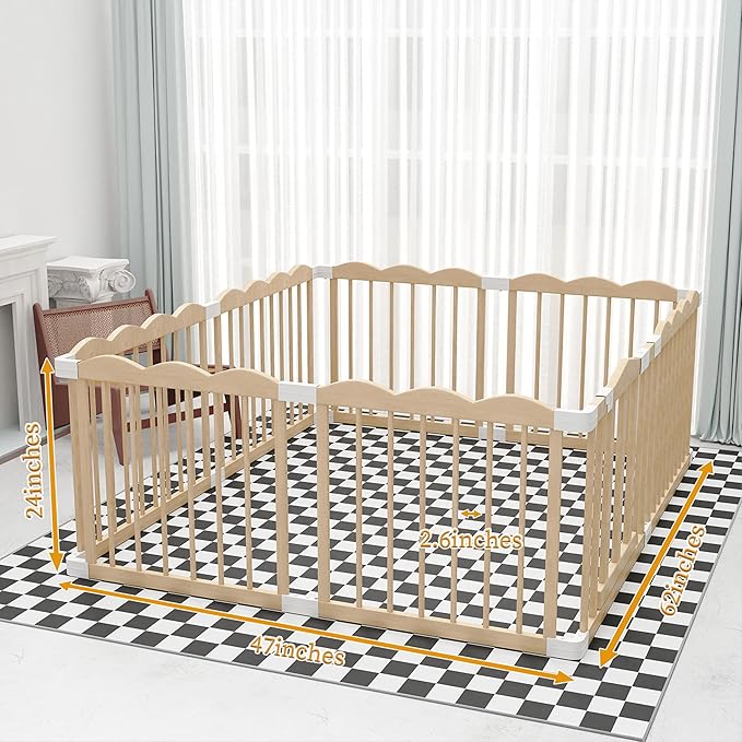 - 【Safety & Stability】: The thin round wooden sticks on both sides of each baby playpen are designed as square wooden sticks, special buttons and non-slip stickers make the enclosure more sturdy and stable. Reasonable height (24 inches) and spacing (2.6 inches) prevents baby's arms and legs from getting stuck. The round wood sticks are 0.59 inches thick, which is thicker and not easy to break.