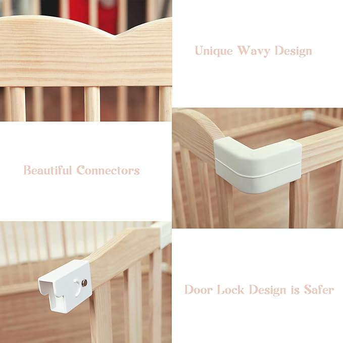 - 【Unique Design】Wooden playpen has a unique design, wood grain and curved design make the baby enclosure look more beautiful.Equipped with connectors, it is convenient to assemble, disassemble and store. It will not take up too much space, keeping your home environment neat and beautiful.