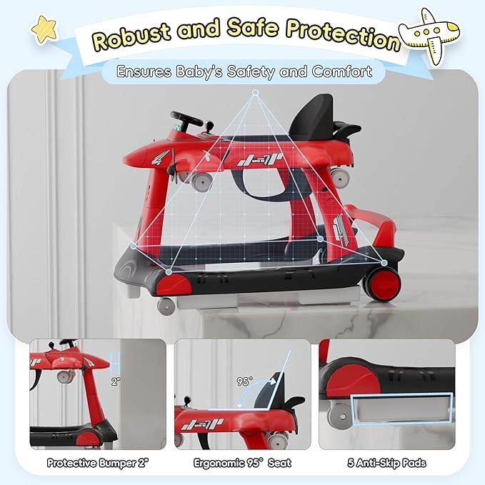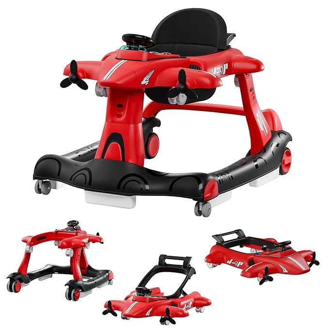 - 6-IN-1 CONVERTIBLE DESIGN: This versatile baby walker is designed for babies aged 6-18 months, assisting them in learning to walk and strengthening their leg muscles. It transitions through six modes: Parent Assist Mode, Self-Walking Mode, Dining Chair Mode, Push Walker Mode, Push Cart Mode, and Toy Airplane Mode. The engaging airplane design meets various developmental needs and keeps your baby entertained.