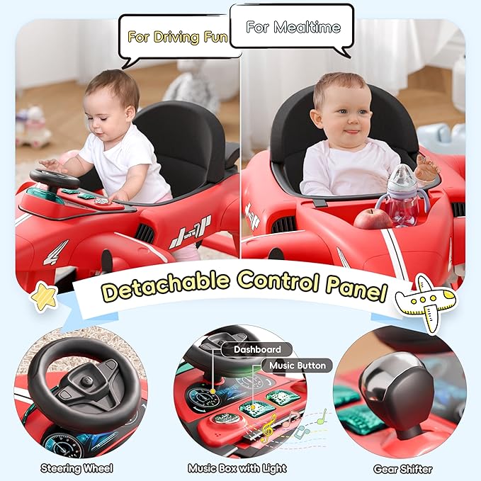 - MUSIC & LIGHT ACTIVITY CENTER: Featuring realistic airplane controls such as a steering wheel, shifter, rear-view mirrors, and light buttons, this walker offers an authentic piloting experience for your baby. Vivid music and lights stimulate your child's senses, making playtime fun and educational. The removable control panel doubles as a standalone toy or dining tray.